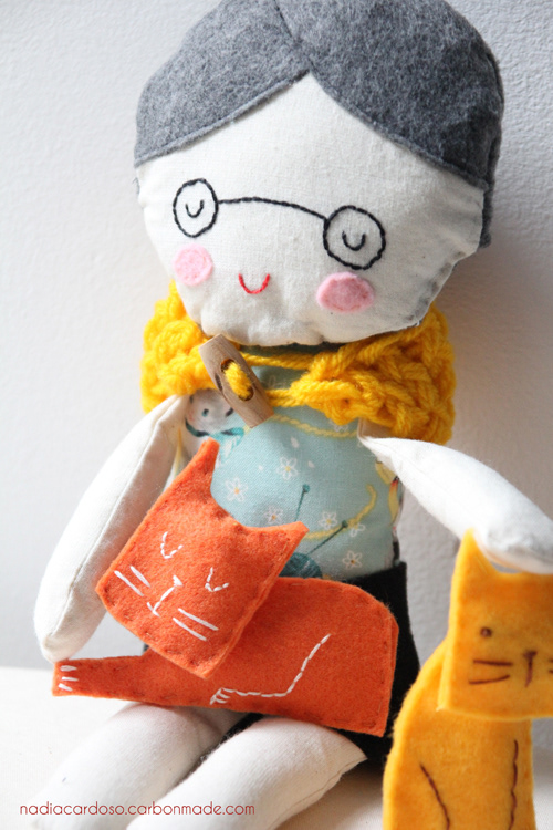 Sculpture of a Crazy cat lady and her two cats. All handmade